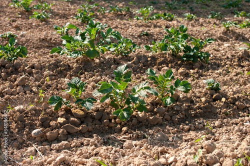 Obraz premium Young potato on soil cover. Planting in garden, spring time.