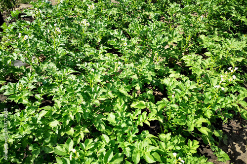 Obraz premium Young potato sprouts, tops in the beds. Growth in potato prices due to a...