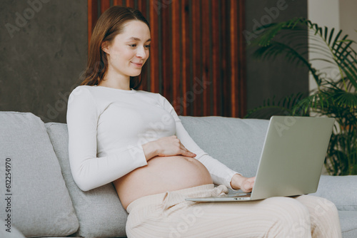 © ViDi Studio, Naklejka premium Young pregnant IT woman in casual clothes hold use work on laptop pc computer sits on grey sofa couch stay at home hotel flat rest relax spend free spare time in living room Maternity family concept