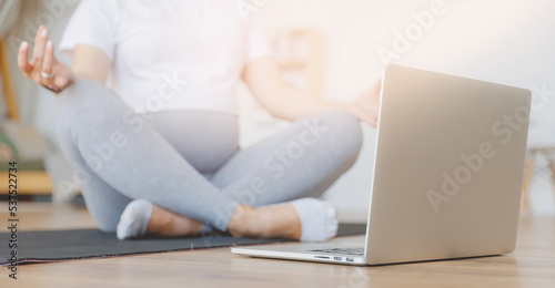 © Parilov, Naklejka premium Young pregnant woman practicing online yoga at home with laptop, banner lifestyle pregnancy concept