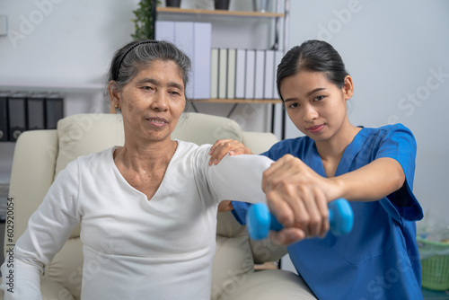 © M+Isolation+Photo, Obraz premium Young pretty asian physiotherapist helping senior female patient holding dumbbell in physical therapy session, concept of World Confederation for Physical Therapy.