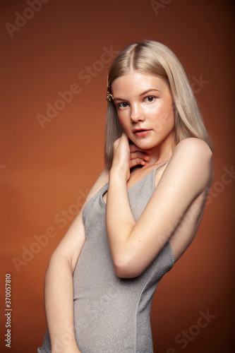 © iordani, Fototapeta premium young pretty blond girl posing on brown background, lifestyle people concept
