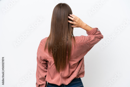 © luismolinero, Obraz premium Young pretty caucasian woman isolated on white background in back position and thinking