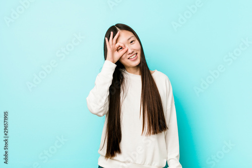 Fototapeta premium Young pretty chinese woman excited keeping ok gesture on eye.