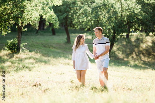 Fototapeta premium Young pretty couple in love walking in park. Handsome cheerful blonde girl in white dress hugging her boyfriend. Man and woman having fun outdoors