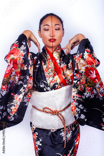 © iordani, Fototapeta premium young pretty geisha in black kimono with sakura, asian ethno closeup on white background isolated