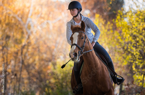 © Dusan Kostic, Obraz premium Young pretty girl - riding a horse with backlit leaves behind