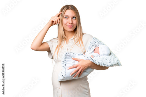 © luismolinero, Obraz premium Young pretty pregnant woman with her newborn baby over isolated chroma key background having doubts and with confuse face expression