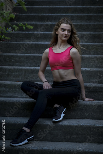 © Dennis, Fototapeta premium Young pretty sportive girl is sitting on the steps on the late summer evening looking down smiling