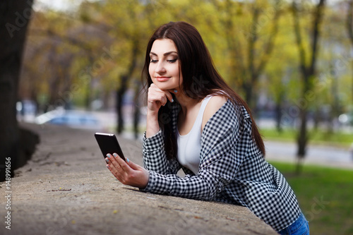 Obraz premium Young pretty stylish woman talking on smart phone in the city park