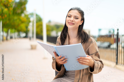 Fototapeta premium Young pretty woman at outdoors holding a notebook