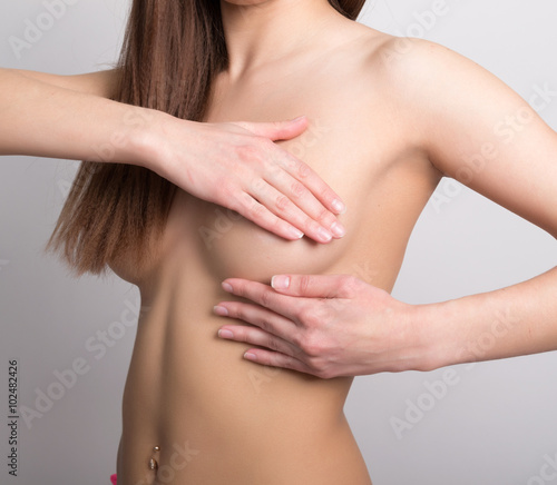 © sandyche, Fototapeta premium Young pretty woman examining her breast for lumps or signs of breast cancer