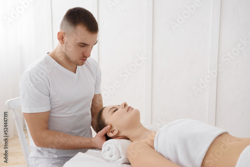 © mirage_studio, Obraz premium Young pretty woman having head massage in spa, white background. Copy space, closeup