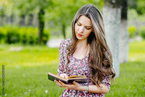 Fototapeta premium Young pretty woman in summer dress relaxing and reading a book in the park