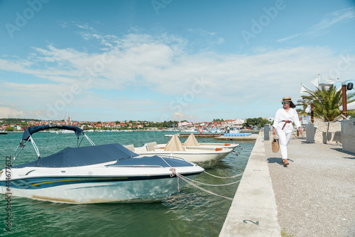 Fototapeta premium young pretty woman in white summer clothing walking by yachts dock