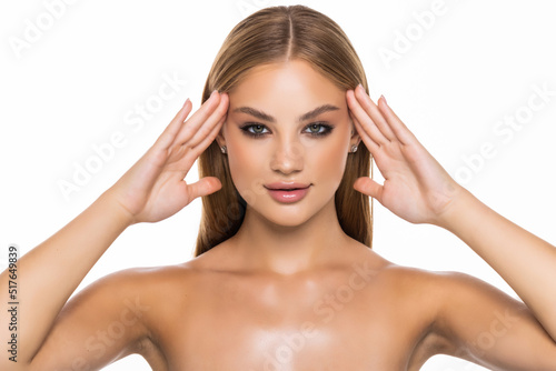 © F8 \ Suport Ukraine, Fototapeta premium Young pretty woman touching her face isolated on white background