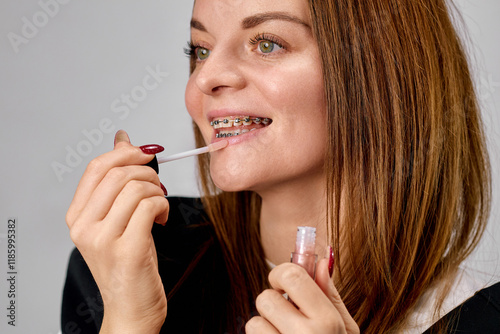 Obraz premium Young pretty woman with braces smears her lips with gloss