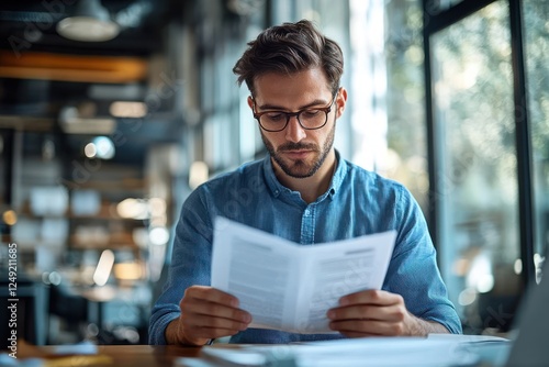 Fototapeta premium Young Professional Man Reading Documents in Modern Office with Laptop Serious...