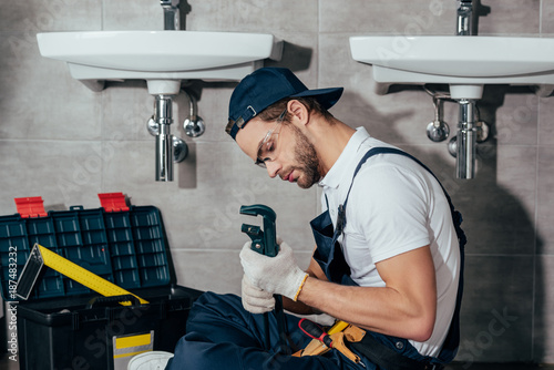© LIGHTFIELD STUDIOS, Fototapeta premium young professional plumber fixing sink in bathroom