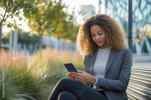 Obraz premium Young professional woman in business casual attire using smartphone outdoors