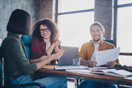 Fototapeta premium Young professionals collaborating and discussing projects in a modern workplace