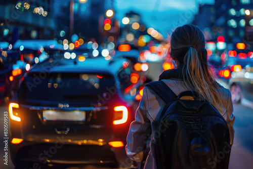 © Degimages, Obraz premium Young professionals queue for ride-sharing pickup, vibrant city lights, eco-friendly transportation alternatives.