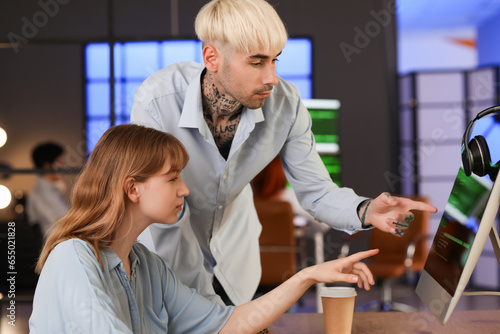 Obraz premium Young programmers working with computer in office at night