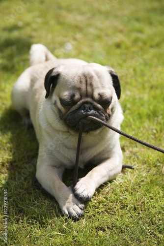 © Ariane Lohmar/imageBROKER, Fototapeta premium Young pug on a meadow, playing with a rope
