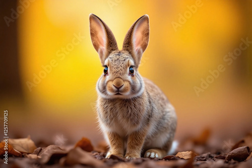 © He, Fototapeta premium young rabbit in forest floor setting brown gray fur dry leaves