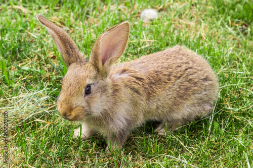 © nosyrevy, Fototapeta premium young rabbit with protruding ears on green grass