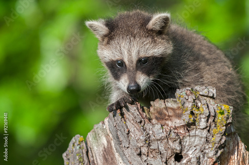 Fototapeta premium Young Raccoon (Procyon lotor) Crouches on Stump