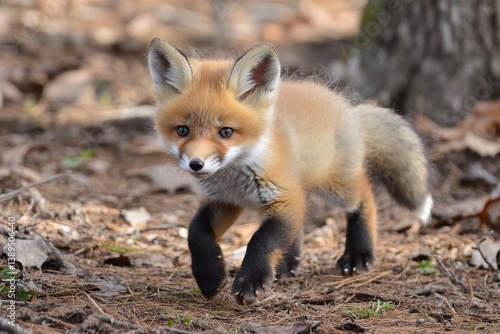 © Ifti Digital, Naklejka premium Young red fox exploring the forest floor among fallen leaves during daylight hours, A young red fox walks in the forest