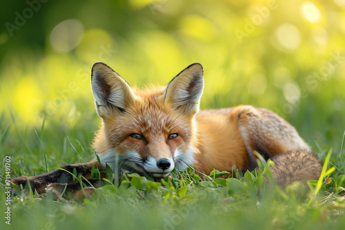 Fototapeta premium Young Red Fox Lying on the Grass in A Green Natural Background, ai technology