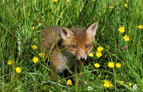 © slowmotiongli, Fototapeta premium YOUNG RED FOX vulpes vulpes CAMOUFLAGED IN LONG GRASS AND YELLOW FLOWERS