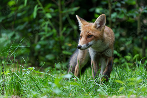 Naklejka premium Young Red Fox (Vulpes vulpes) searching for food in the forest of Noord-Brabant in the Netherlands