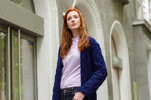 © retoncy, Fototapeta premium Young red woman walking in the city