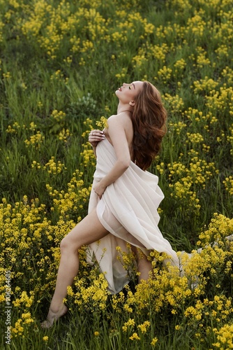 © Alex Barera, Fototapeta premium Young redhead model posing in field with yellow colors. Girls in white sheet