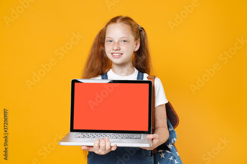 Naklejka premium Young redhead school girl 12-13 years old in white t-shirt blue denim uniform backpack hold laptop pc computer isolated on yellow background children studio portrait Kids education lifestyle concept