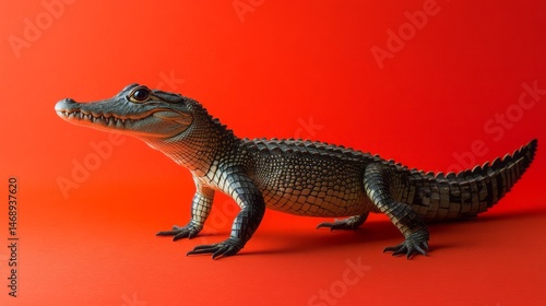 Fototapeta premium Young reptile against a vibrant red backdrop.