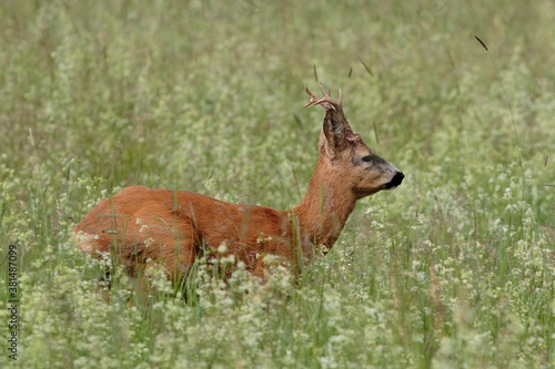© Daniel Dunca, Obraz premium Young roe in a dynamic pose jumping over a meadow full of white flowers. Roe deer, Capreolus capreolus.