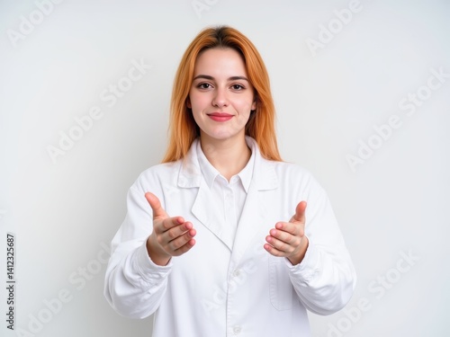 © Ouzhan, Fototapeta premium Young Romanian scientific woman isolated on white background inviting to come with hand. Happy that you came