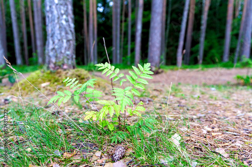 © Jorens, Fototapeta premium Young Rowan Tree Sapling in Forest