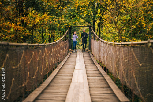 Obraz premium Young runners start jogging on a wooden suspension bridge in the middle of a...