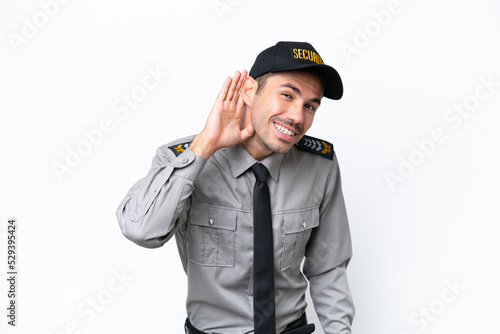 Fototapeta premium Young safeguard man over isolated white background listening to something by...