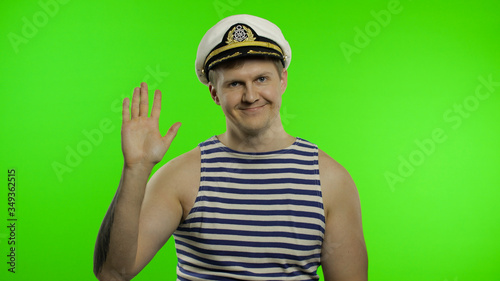 Fototapeta premium Young sailor man waving hand. Seaman guy in sailor's vest. Chroma key