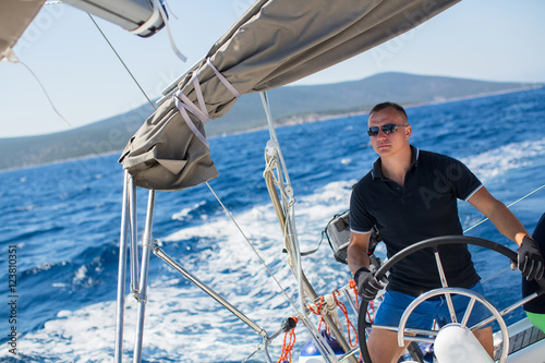 © De Visu, Fototapeta premium Young sailor skipper manages sailing vessel during regatta race in the open sea.