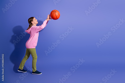 © deagreez, Fototapeta premium Young schoolgirl joyfully playing with a basketball against a vibrant purple background, wearing casual pink hoodie and green pants.