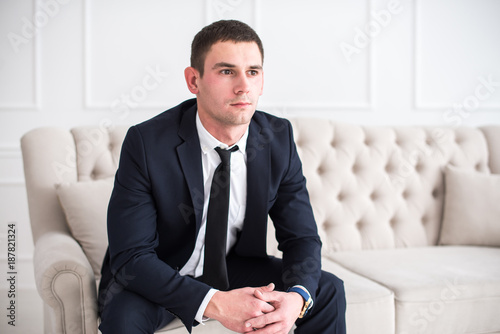 Fototapeta premium Young serious and confident man in a business suit sitting on the couch