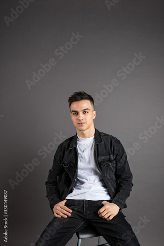 Fototapeta premium Young serious man posing in studio. Gray background