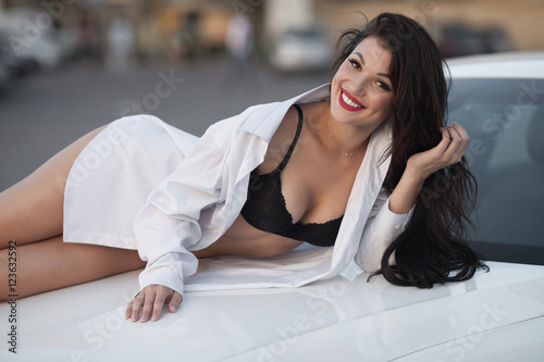 © lashkhidzetim, Naklejka premium Young sexy brunette woman in black lingerie and white shirt on sport car hood.